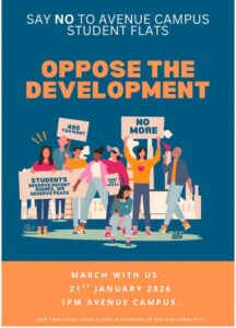 A reminder about the Community Objection Walk tomorrow Wednesday 21 January at 1pm, opposing the University’s plans to build 400+ student accommodation rooms in large blocks on the green space and car park surrounding the teaching blocks at the Avenue Campus.
