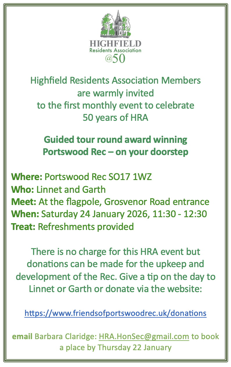 The first event for HRA members will be a Guided Tour around Green Flag award winning Portswood Rec on Saturday 24 January at 11.30am, led by Linnet and Garth.