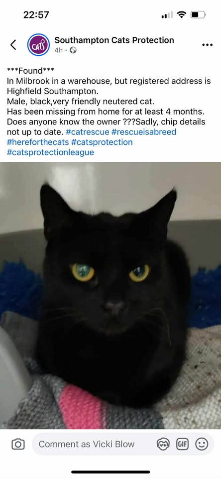 Found in warehouse in Millbrook but registered address is in Highfield: male, black, very friendly, neutered cat