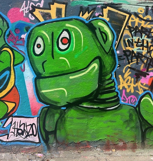 Grafitti gorilla (green) in the Avenue underpass! Photo by Ken, March 2026