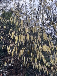 Hazel catkins on the corner of Westwood Road and The Avenue today (26/1/26) at 08:03. Photo Barbara Claridge, HRA HonSec