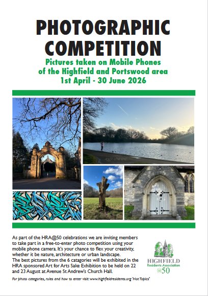 Posted by Highfield Residents' Association on Apr 17, 2026 in News | 0 commentsThere are six categories, two entries each month – lots of creativity! Check out the rules in the link below, including details of how to enter and the six categories. The top three photos in each category will be exhibited at ‘Art for Arts Sake’, sponsored by HRA in August at Avenue St Andrews Church. So – get snapping!