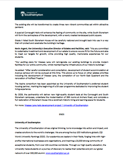 University of Southampton official Press Release (Monday 23 March 2026 – ‘University of Southampton to submit plans for creation of vibrant new student community’